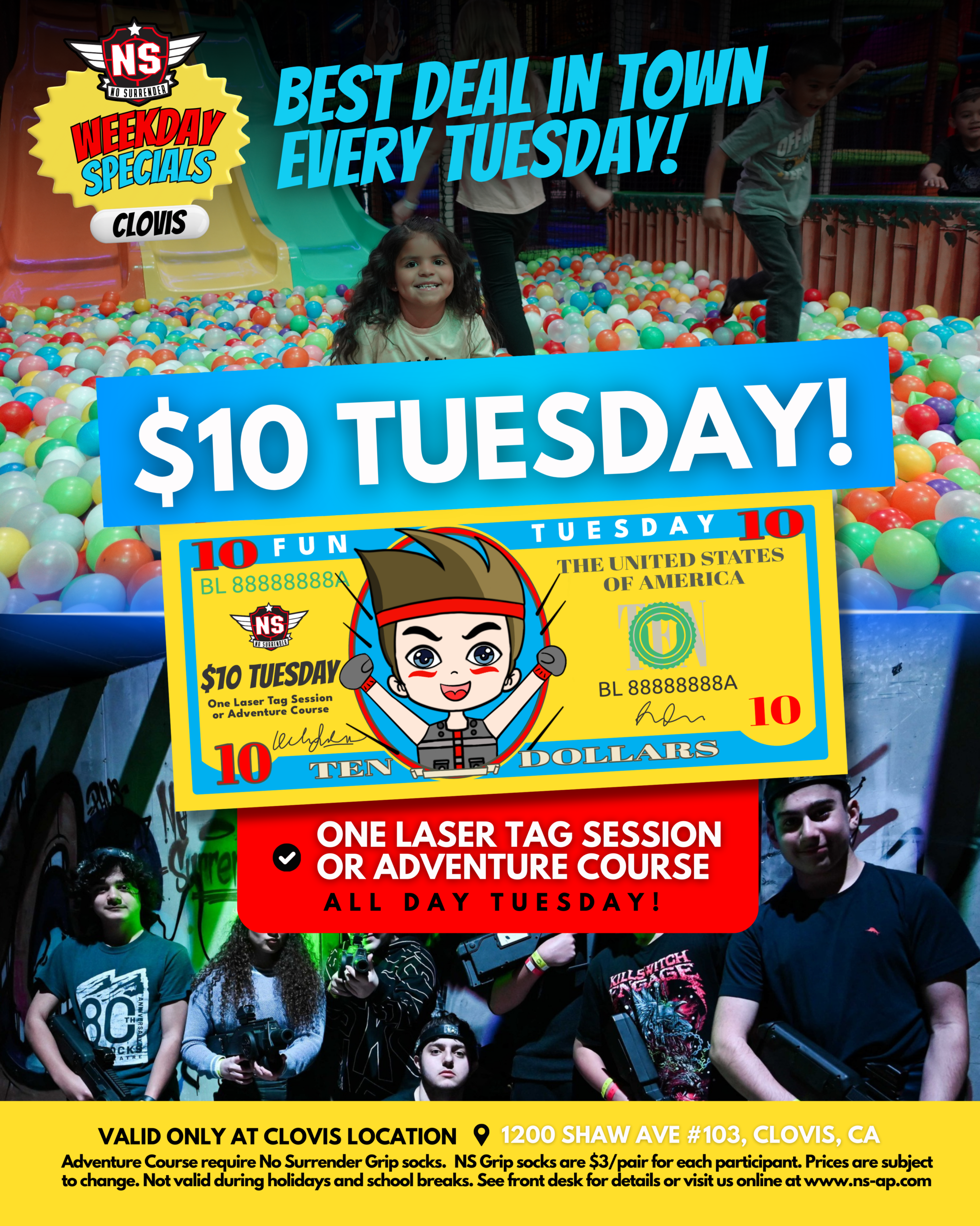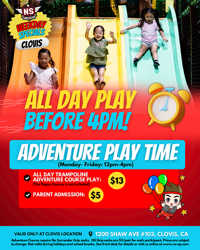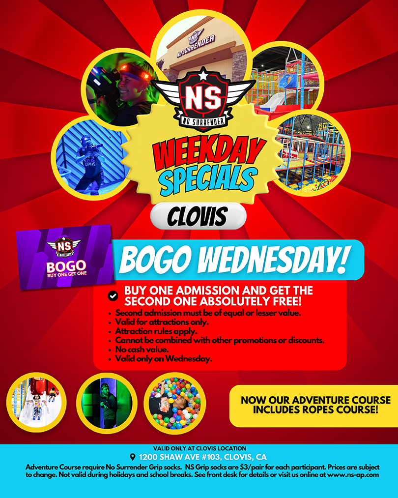 $3 No Surrender Grip Socks required. During the first hour, arcade, color lights, and music will be turned off. Once No Surrender Adventure Park is open to the public, arcade, color lights, and music will be turned on.